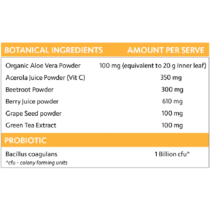 - Contains Probiotics, Vitamin C, Aloe Vera, Antioxidants and Berries.
